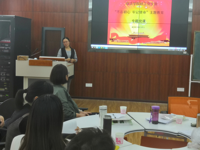 本网讯(文、图/李松柏)2019年10月17日下午,政法学院社工党支部在实训楼A510开展“不忘初心,牢记使命”主题教育-专题调研讨论会暨主题教育党课,全体社工党支部成员参与,由党支部书记李如春主讲。