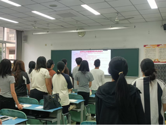 随后,在学习委员的带领下,同学们精神抖擞地进行学风承诺。他们齐声宣誓:“在新学期里,我们将严格自律,自觉遵守课堂教学纪律,明确学习目标……”同学们纷纷表示,将把承诺铭记于心,以实际行动展现新时代学子勤奋学习的精神风貌,携手共筑一个积极向上、风清气正的学习环境,让良好的学风在校园里蔚然成风。
