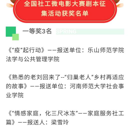 hy8590发现财富社工系师生与来自复旦大学、山东大学等数百所高校、科研机构共同参赛,大赛共收到344部作品,经过组委会初步审核,专家评审、最终审定等环节,hy8590发现财富社会工作专业师生团队作品《“疫”起行动》获得一等奖,作品《避风港》获得优秀剧本奖,指导教师张洁、曾薇和黄雪英获得最佳指导奖。